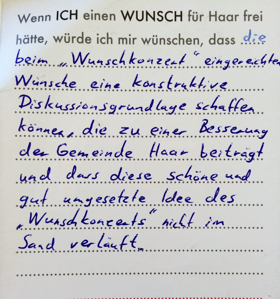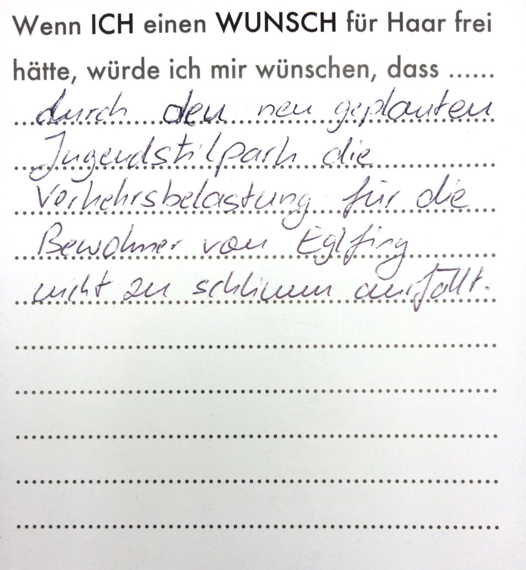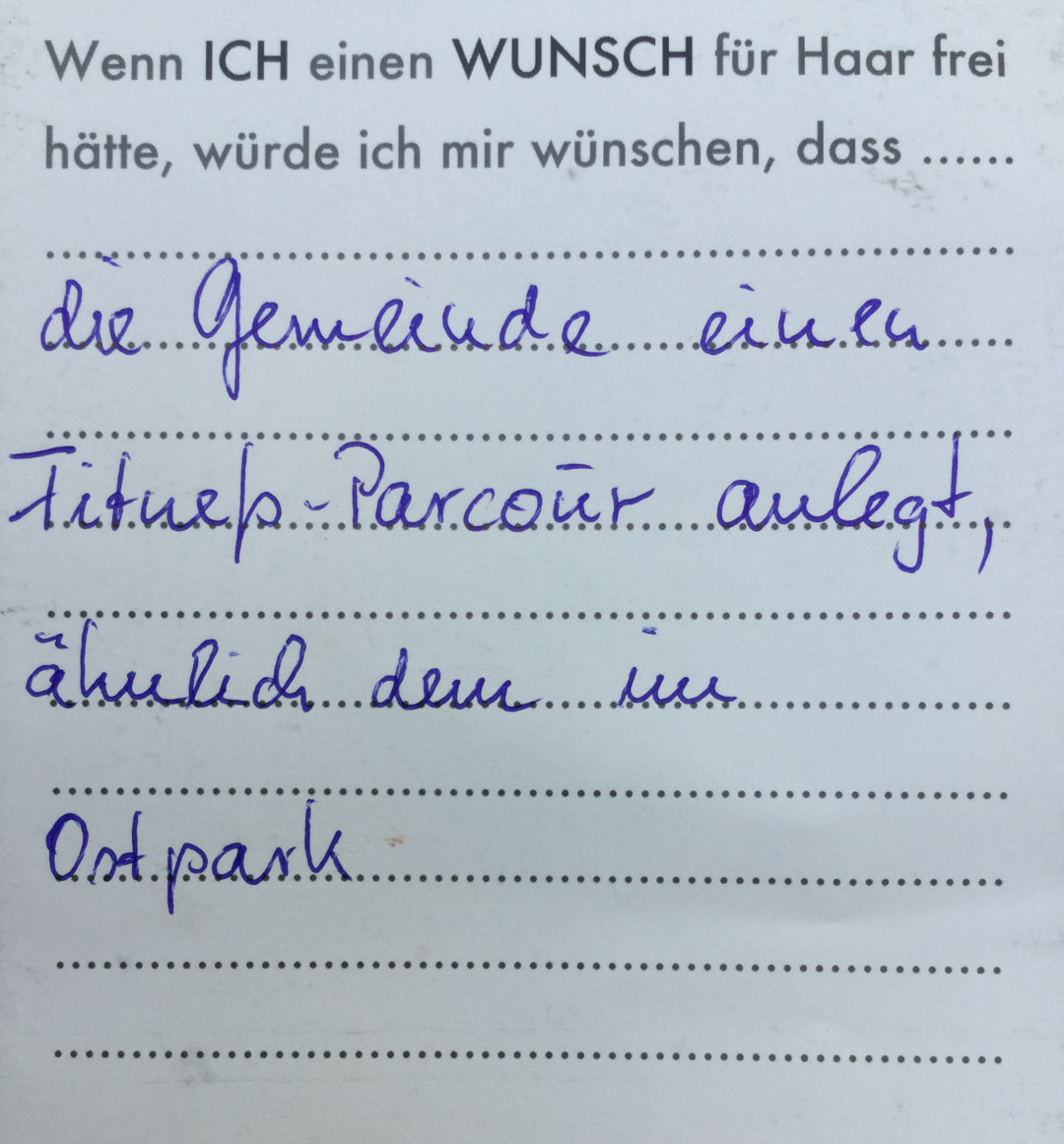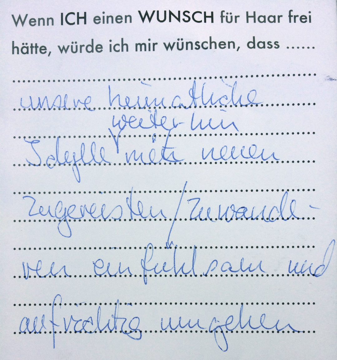 Eine Videoinstallation, die den Wünschen der Bevölkerung für ihren Wohnort nachspürt. Die Besucher konnten selbst auch noch Wünsche formulieren und sie in Form eines Wunschzettels dem Werk hinzufügen. Hier ist ein Still aus dem Video zu sehen, sowie die gesammelten Wunschzettel.