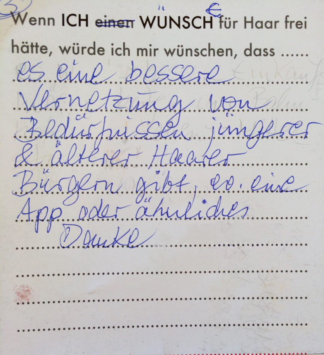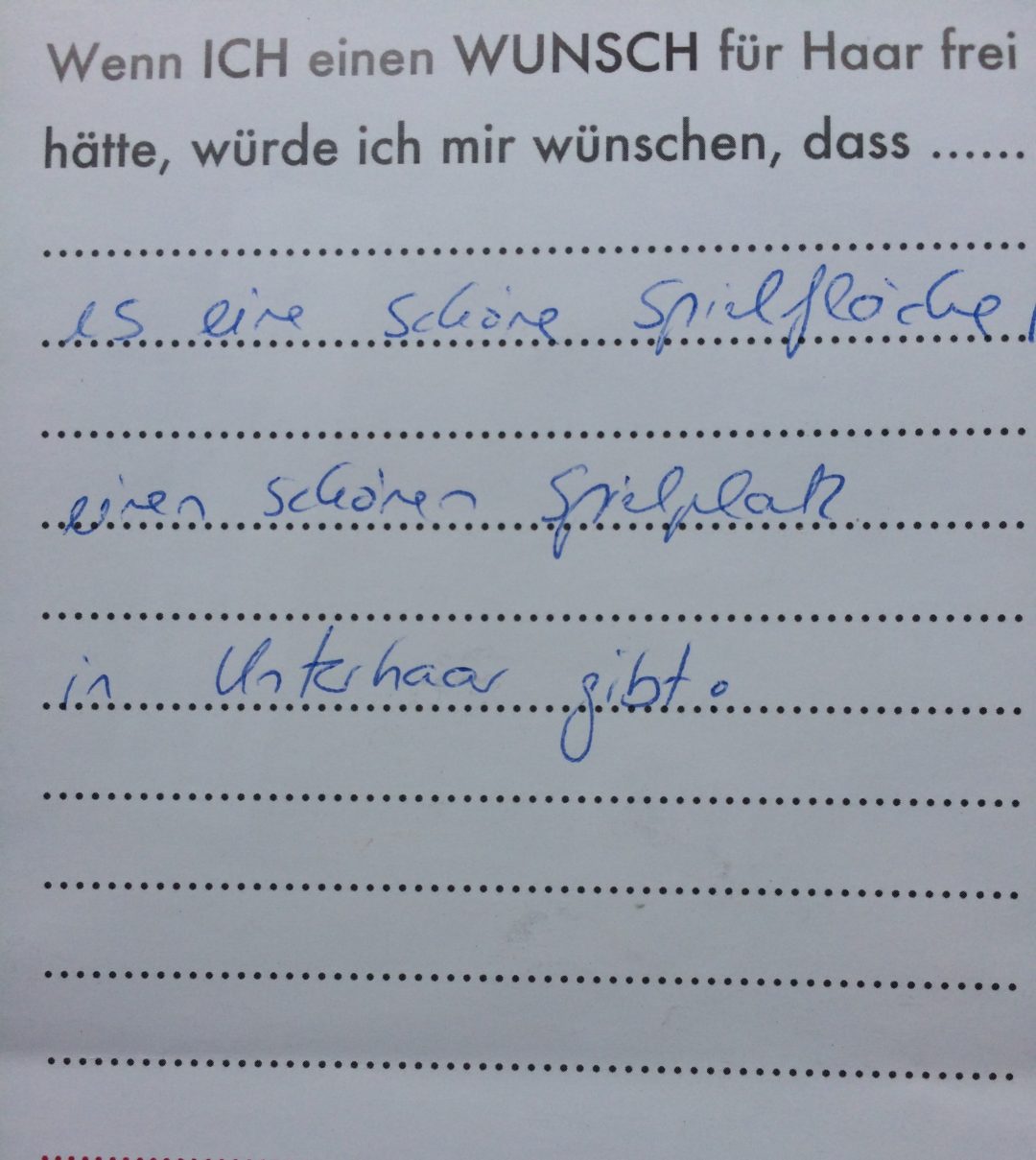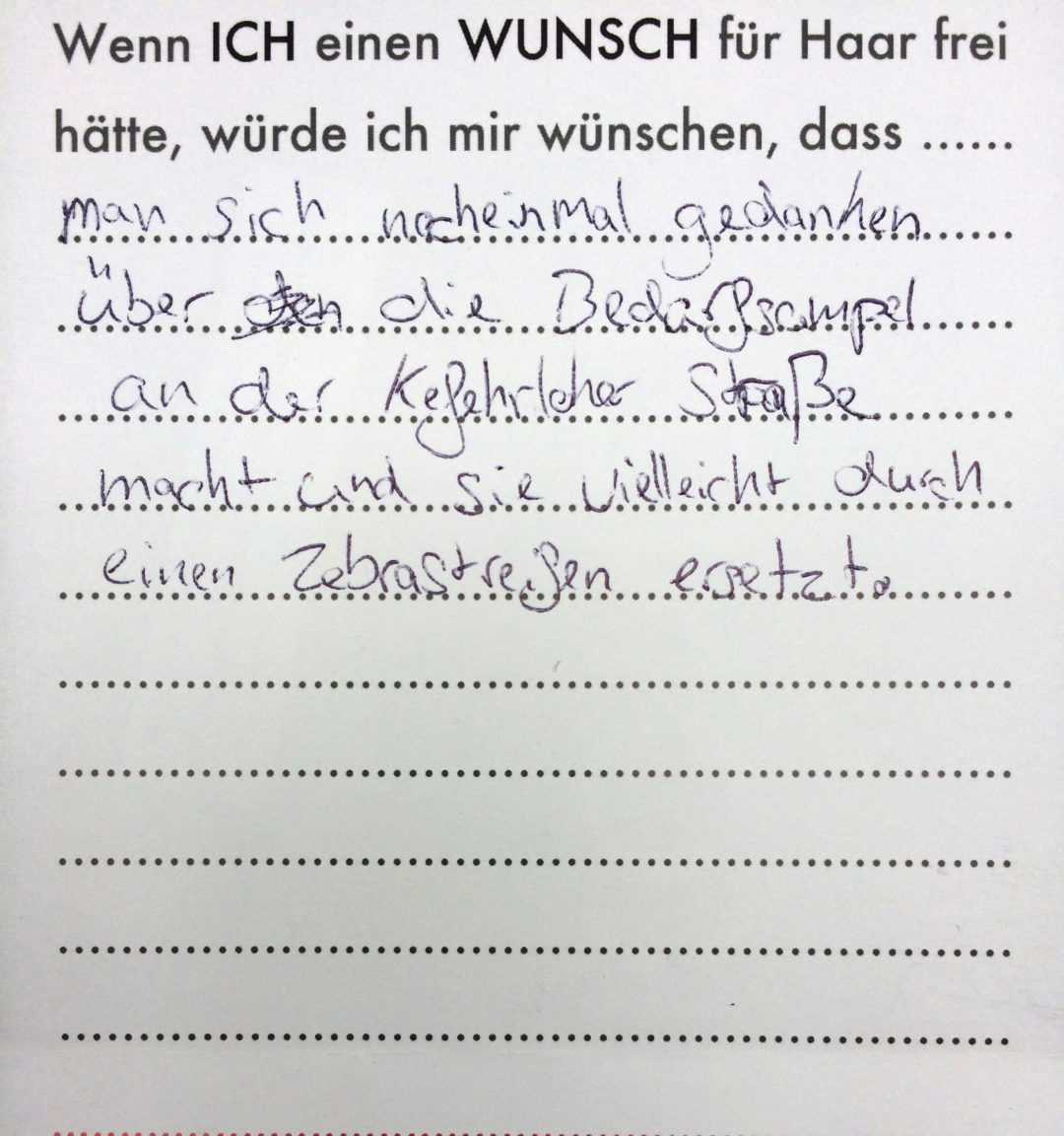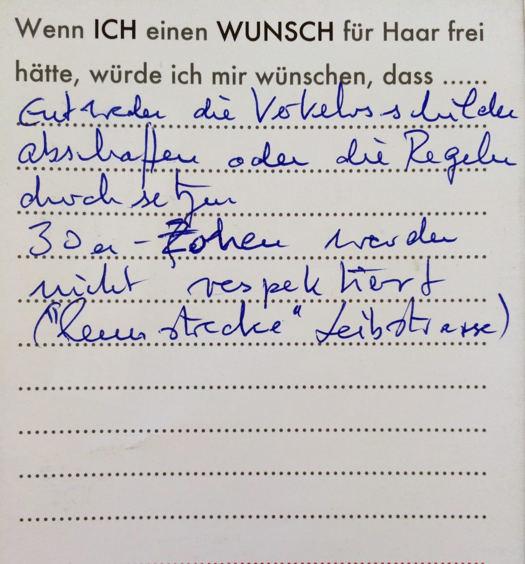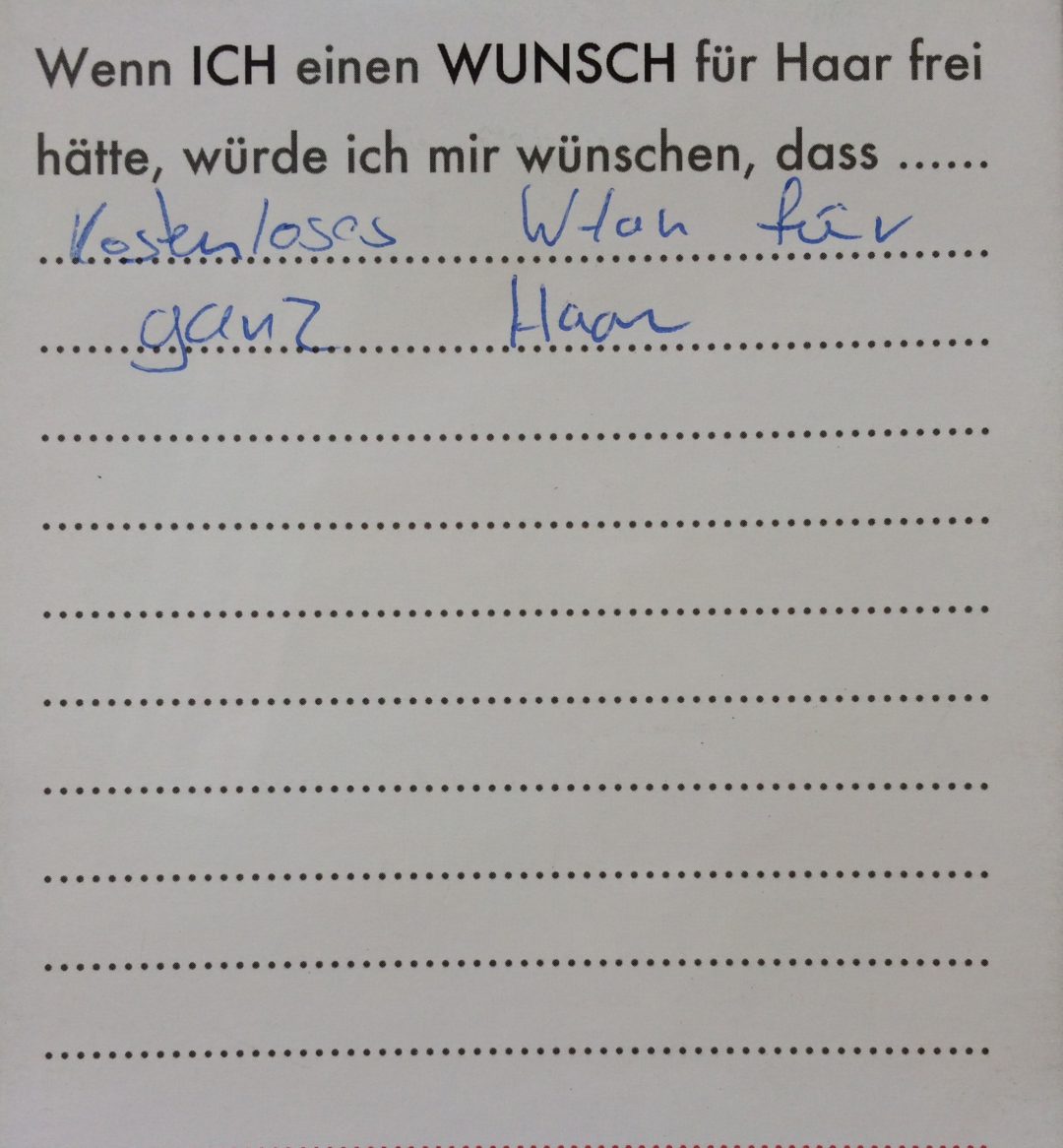 Eine Videoinstallation, die den Wünschen der Bevölkerung für ihren Wohnort nachspürt. Die Besucher konnten selbst auch noch Wünsche formulieren und sie in Form eines Wunschzettels dem Werk hinzufügen. Hier ist ein Still aus dem Video zu sehen, sowie die gesammelten Wunschzettel.